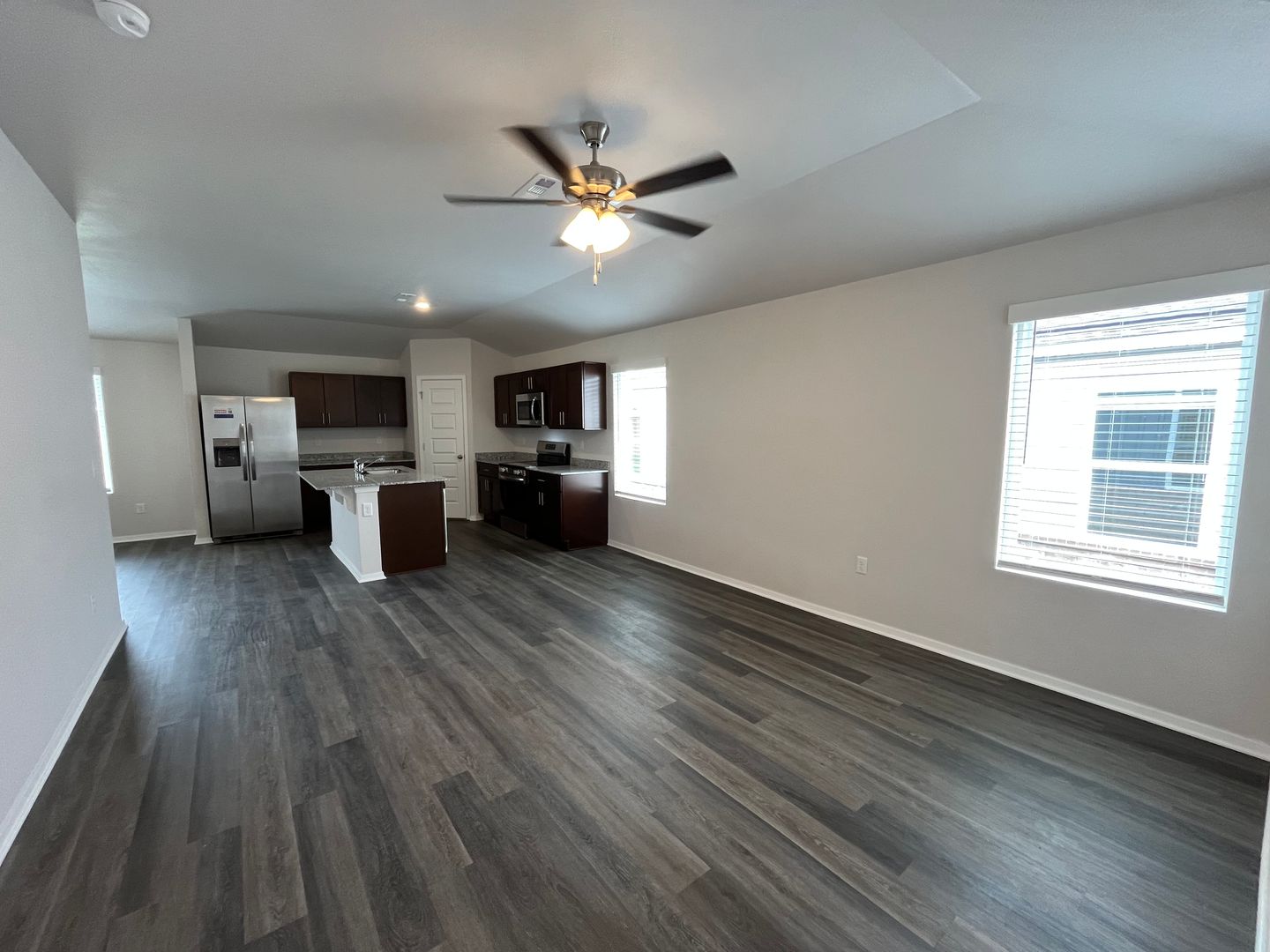 The open concept design creates a spacious and welcoming atmosphere, enhanced by the luxury vinyl plank flooring and large windows adorned with window coverings.