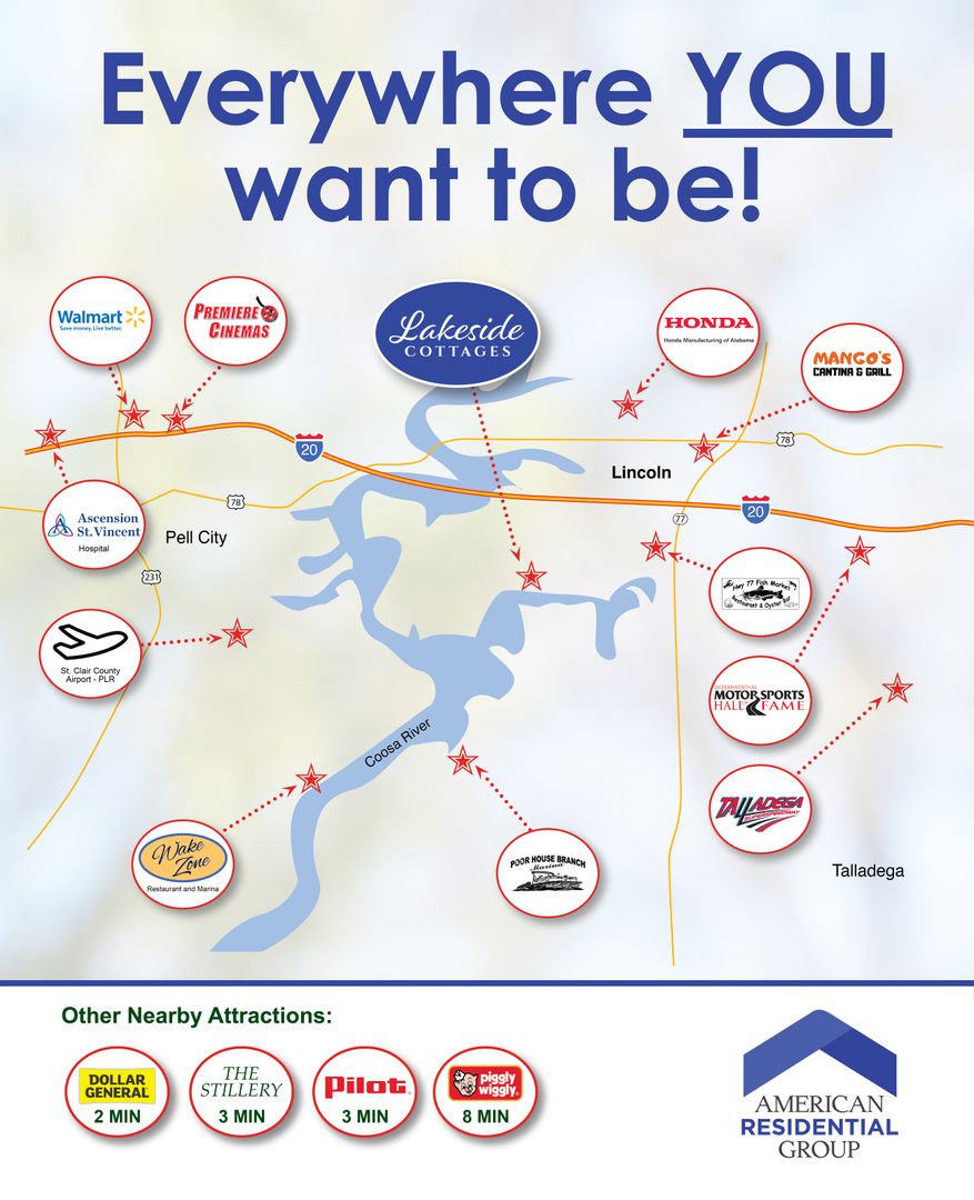 Lakeside Cottages community is located off Stemley Rd and Rushing Springs Rd, a stones throw from Coosa River and easy access to I-20.