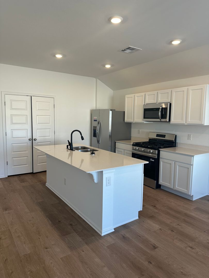 steel appliances, a convenient kitchen island, and a pantry for extra storage. The open concept