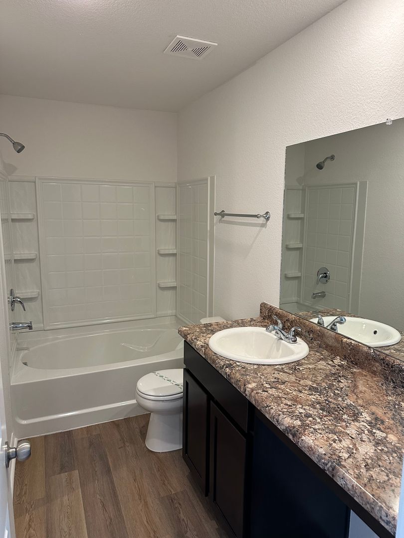 This modern home features luxury vinyl plank flooring throughout, an open concept layout perfect for entertaining, a spacious primary suite, large walk-in closets, and stainless steel appliances in the kitchen.