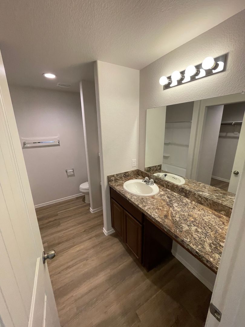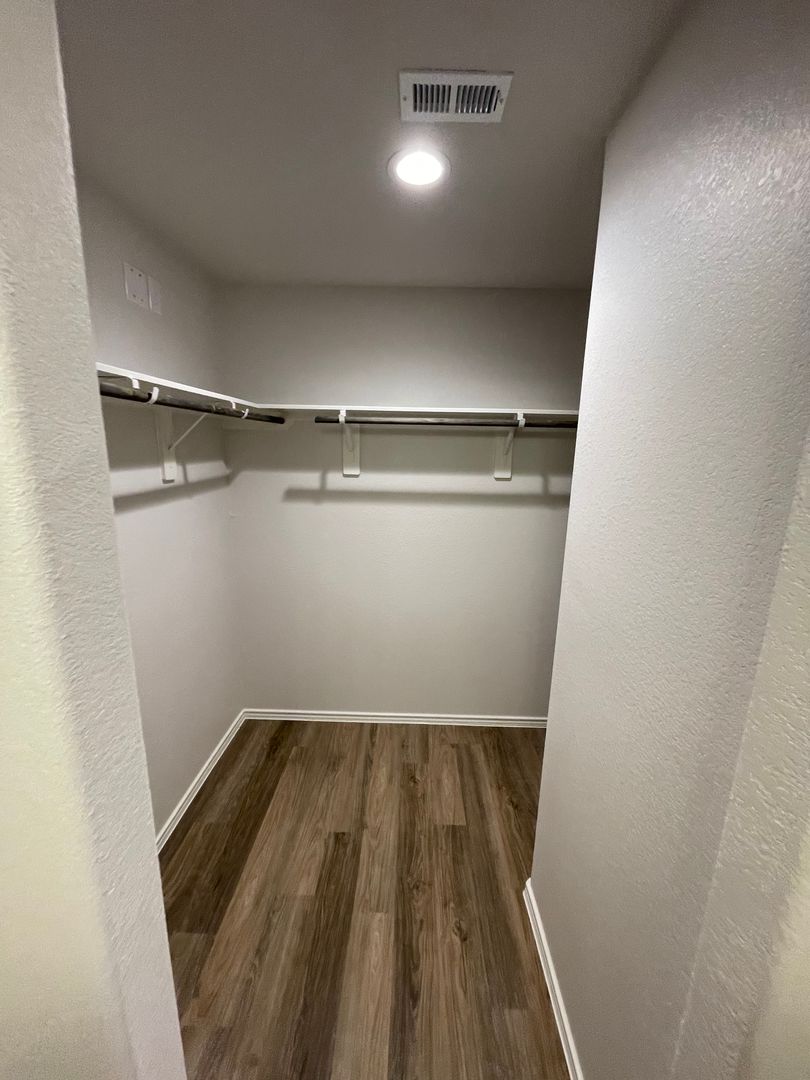 The primary suite has a spacious walk-in closet and private bath.