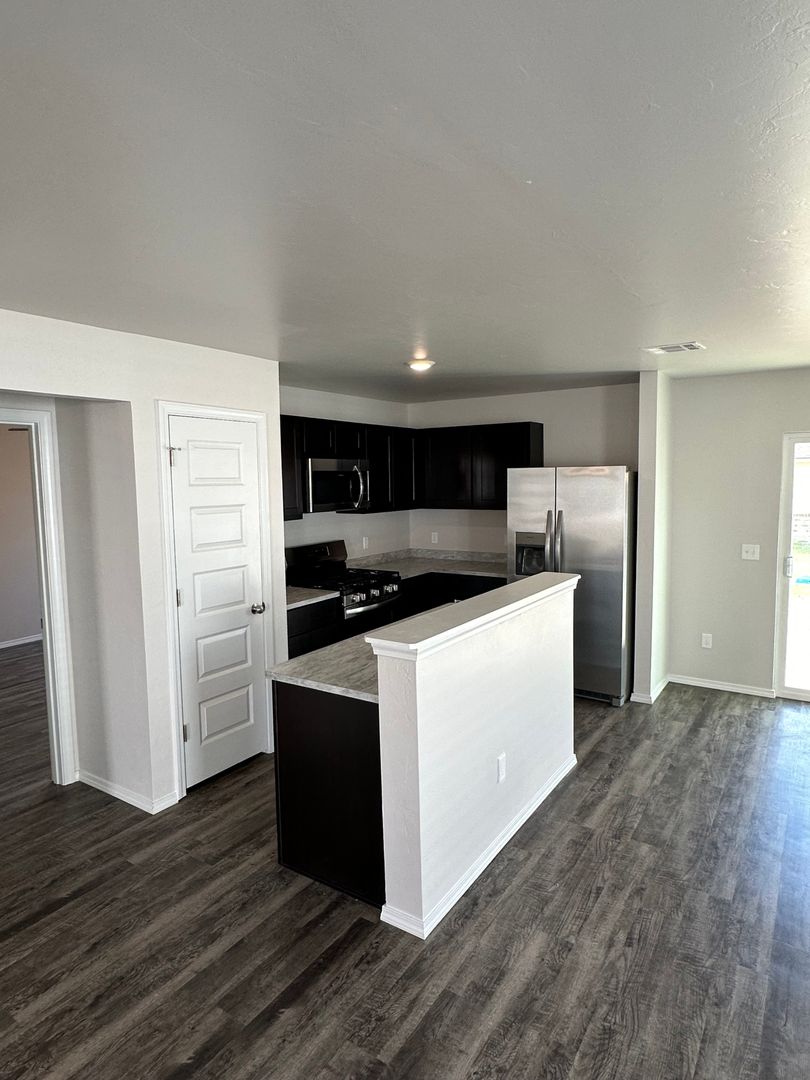 The kitchen is equipped with stainless steel appliances, a kitchen island, and a pantry for all your storage needs.