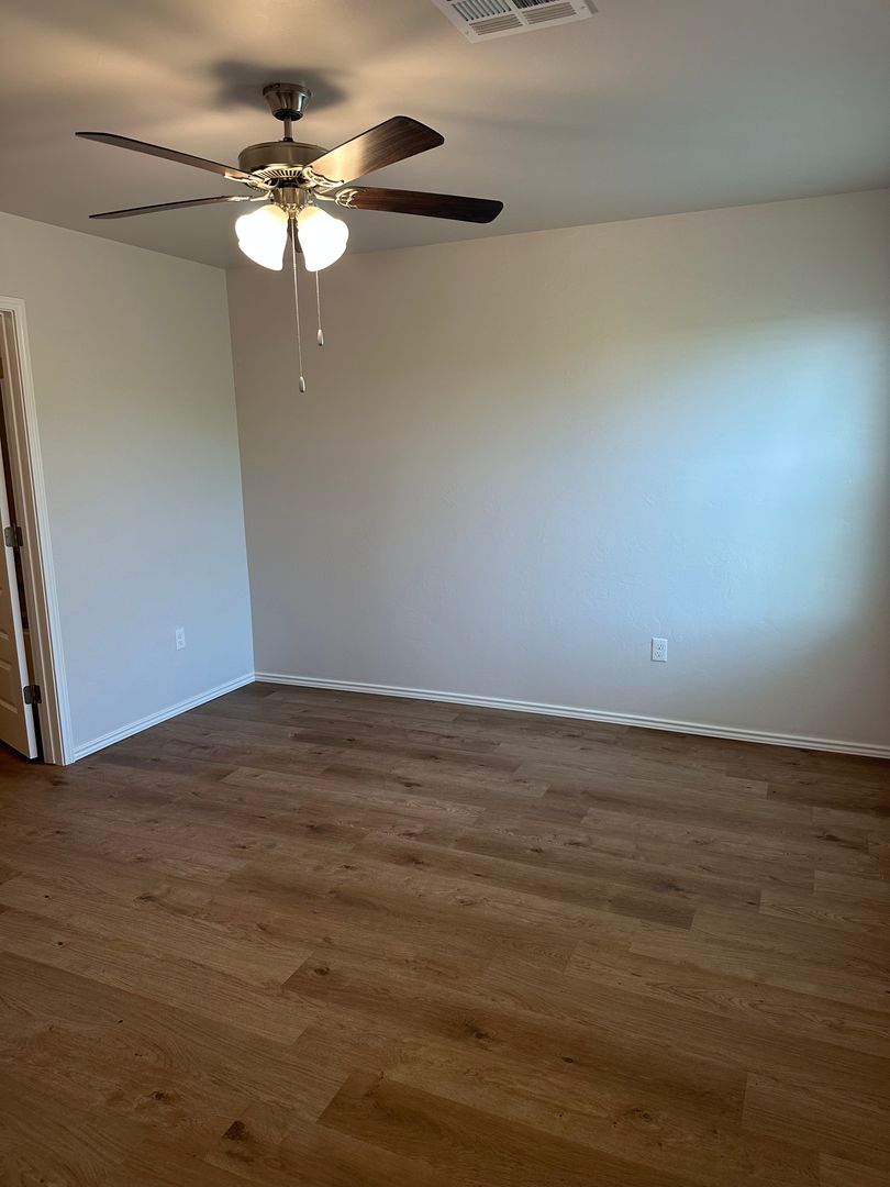 Each bedroom is equipped with large closets and ceiling fans for added comfort.