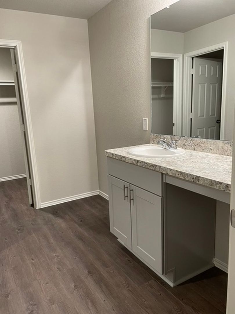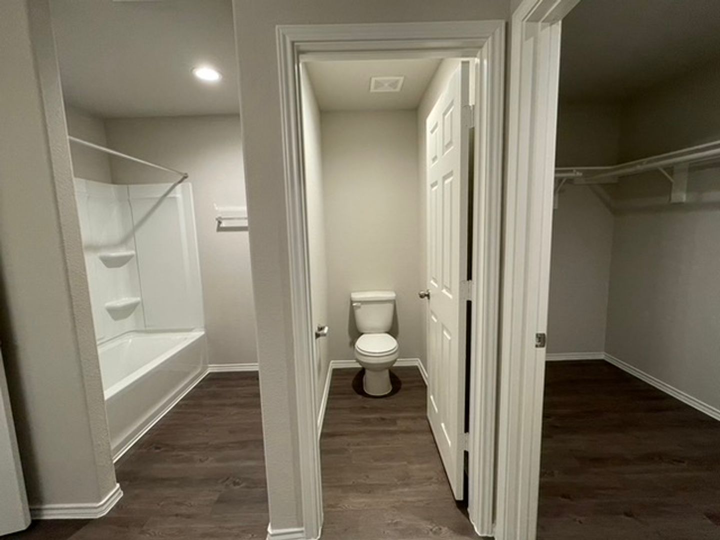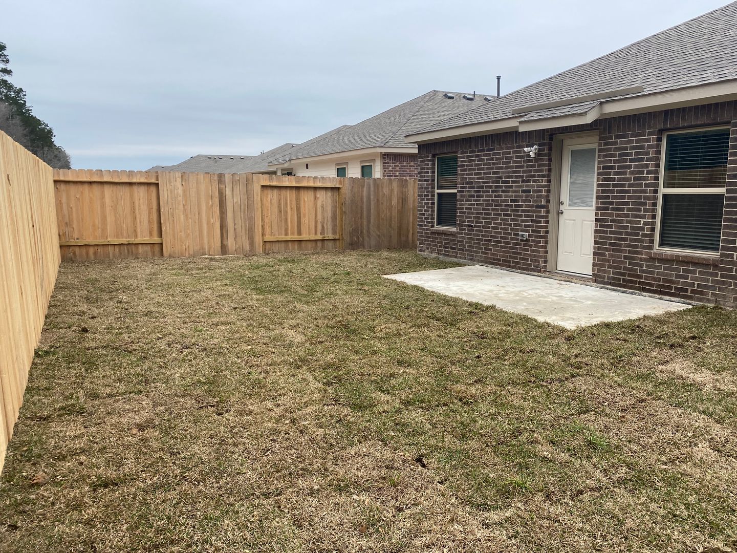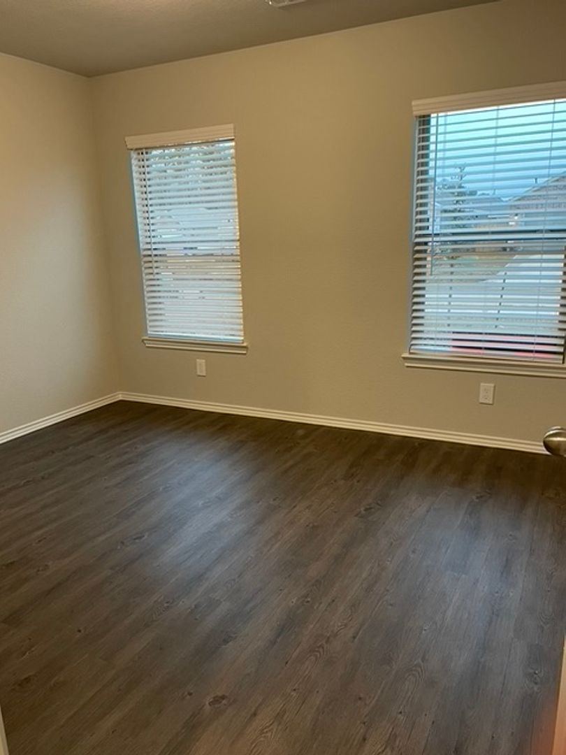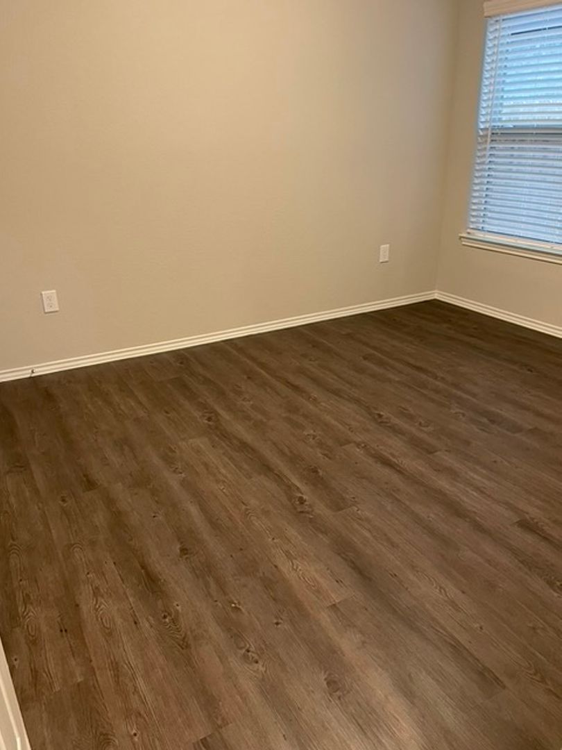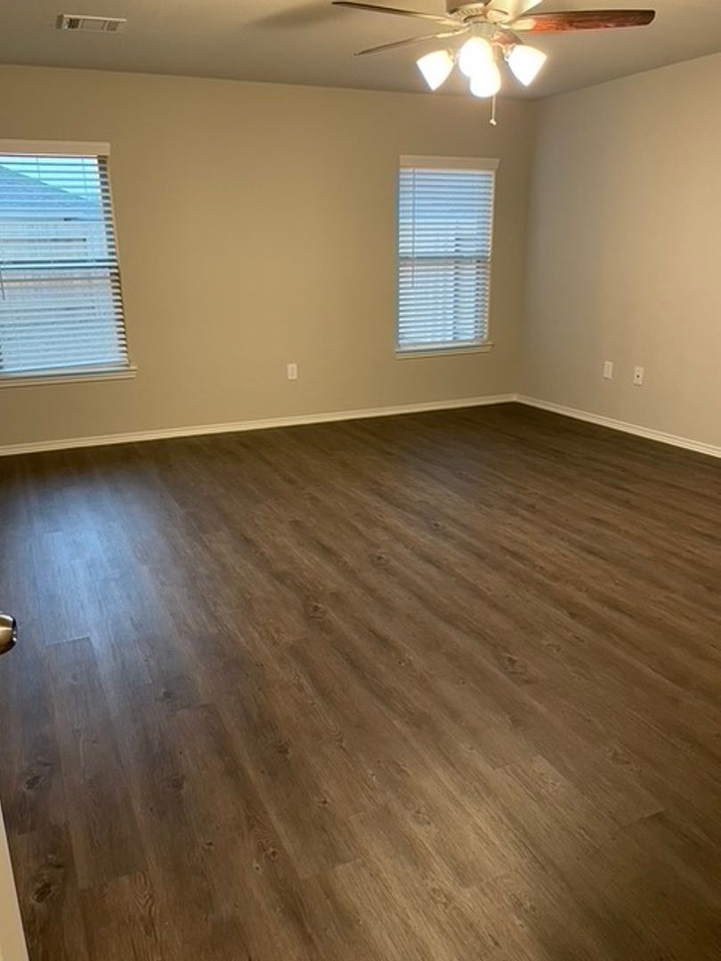 This spacious four-bedroom, two-bathroom house in New Caney, TX offers luxury vinyl plank flooring throughout the open floor plan.