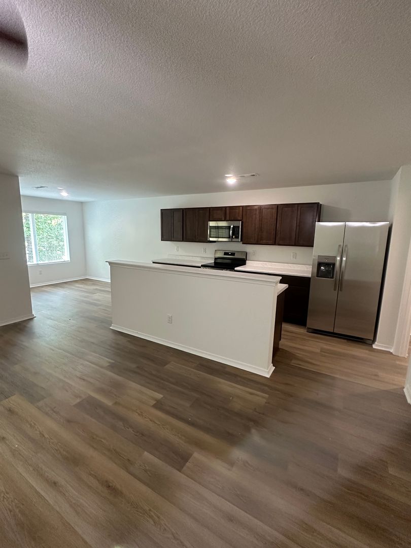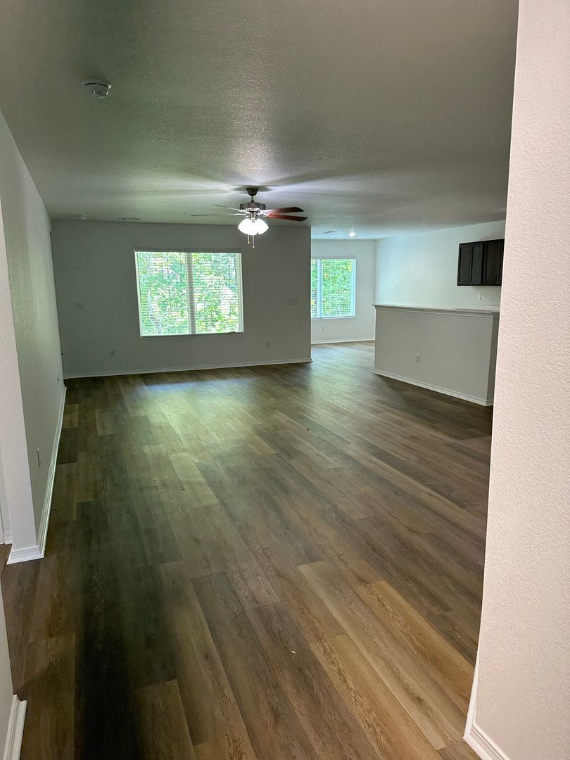This stunning three bedroom, two bathroom home boasts a modern open concept design with luxury vinyl plank flooring and stainless steel appliances in the kitchen.