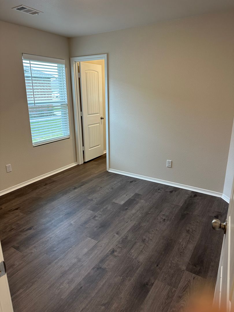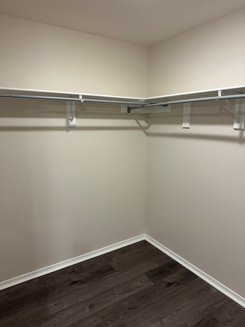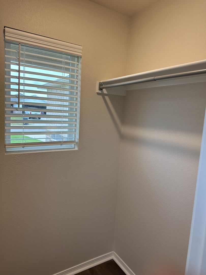 in closet and a private bathroom. Additional features include window coverings for privacy, a