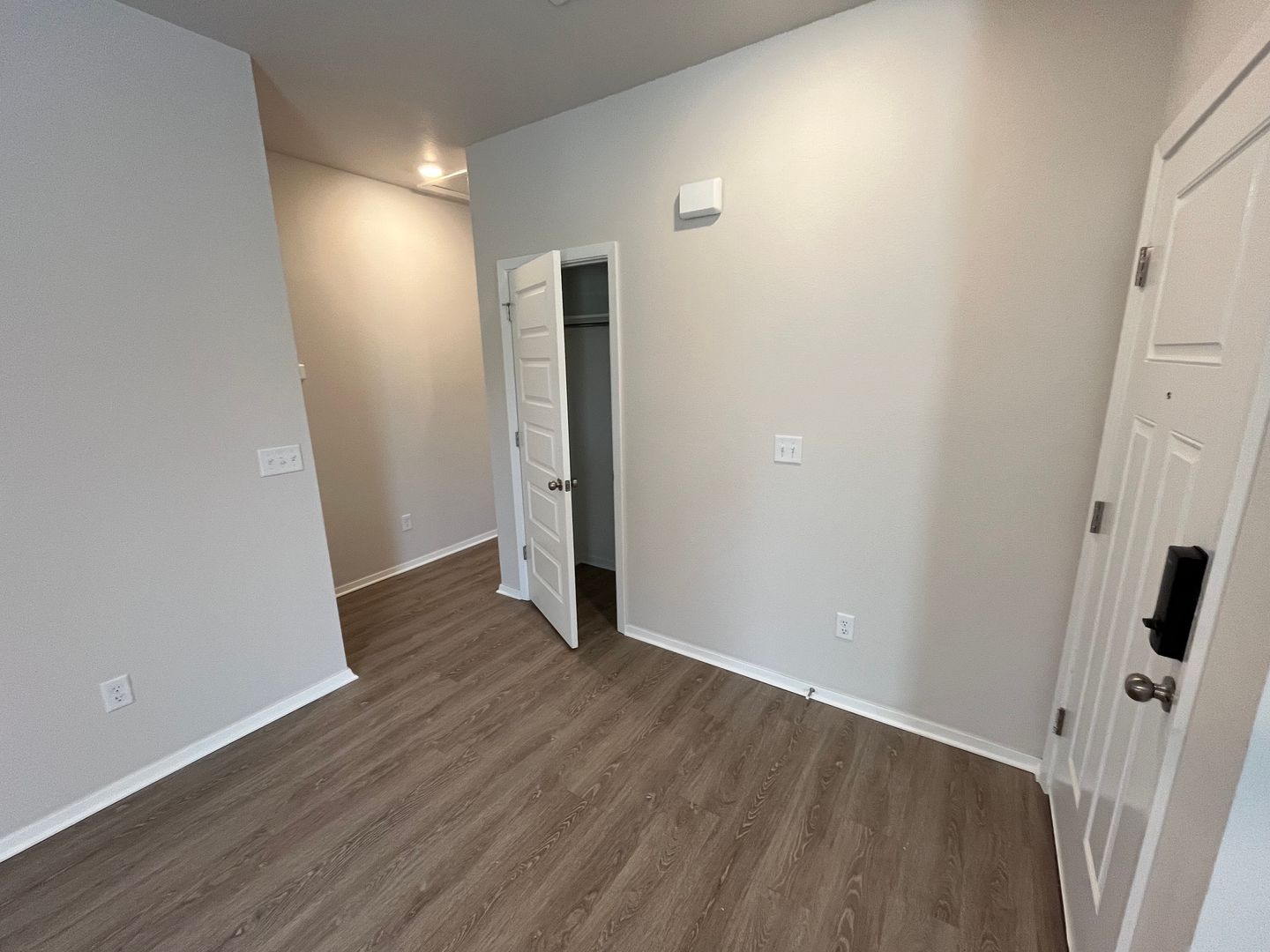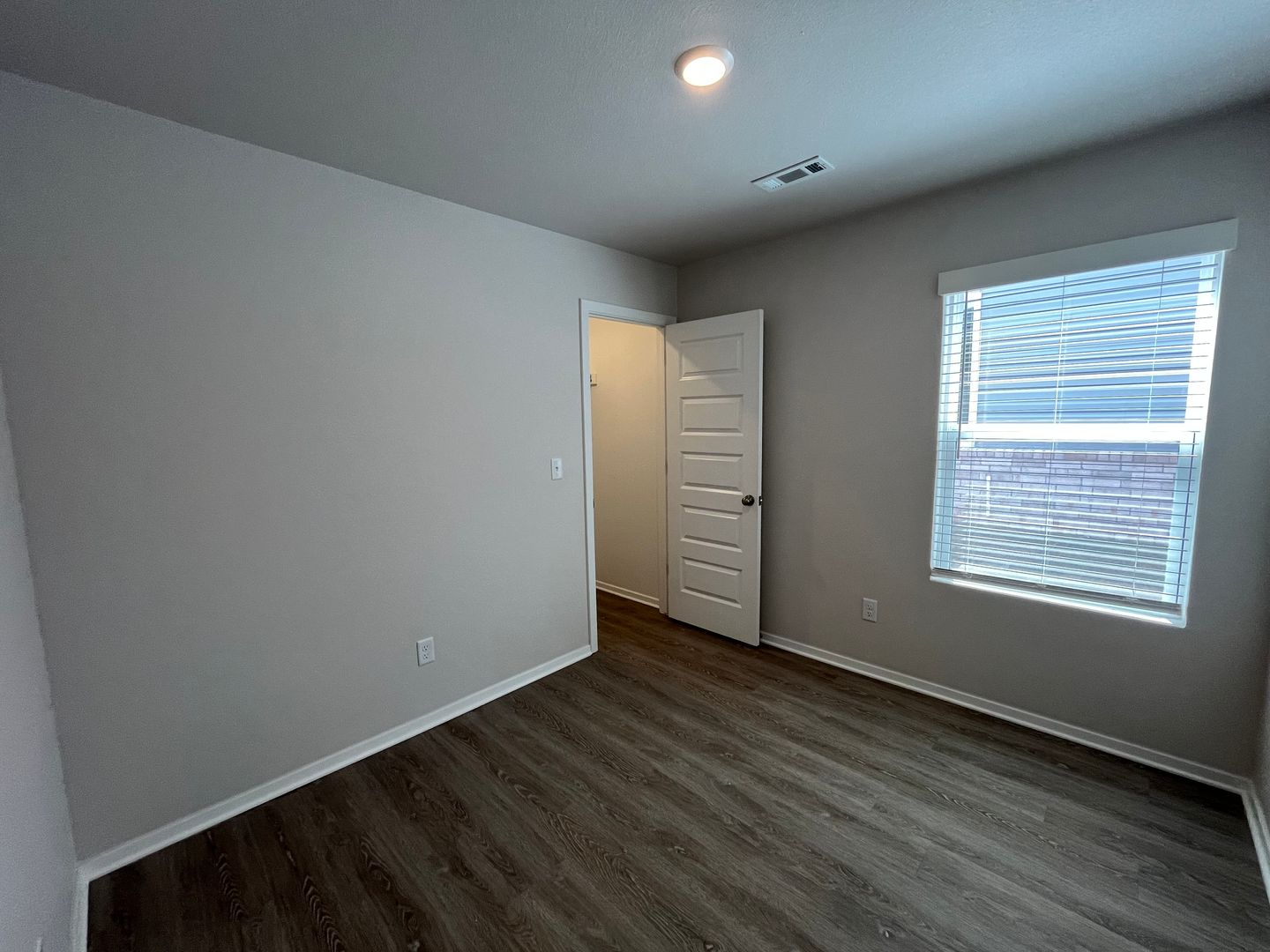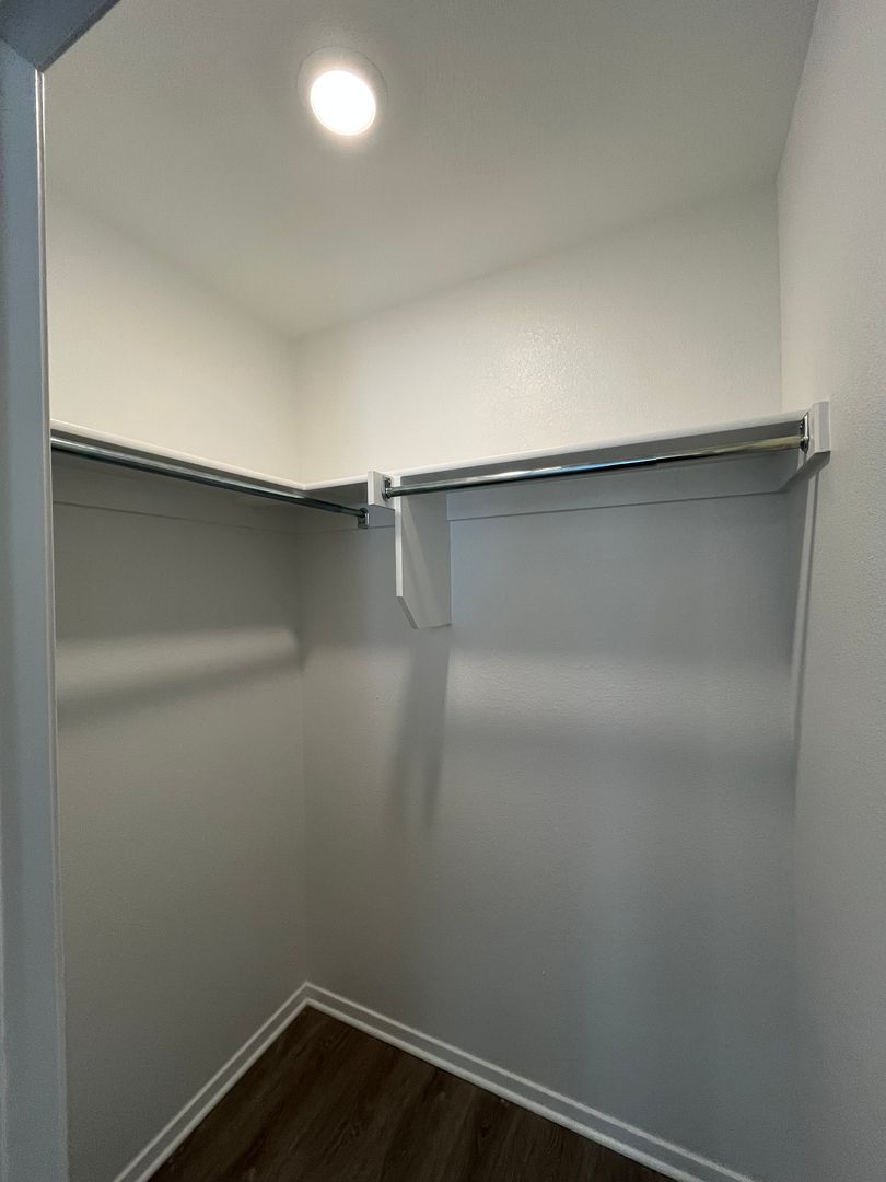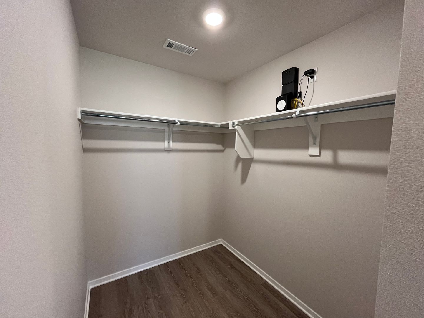 The spacious primary suite includes a walk-in closet, providing ample storage space.