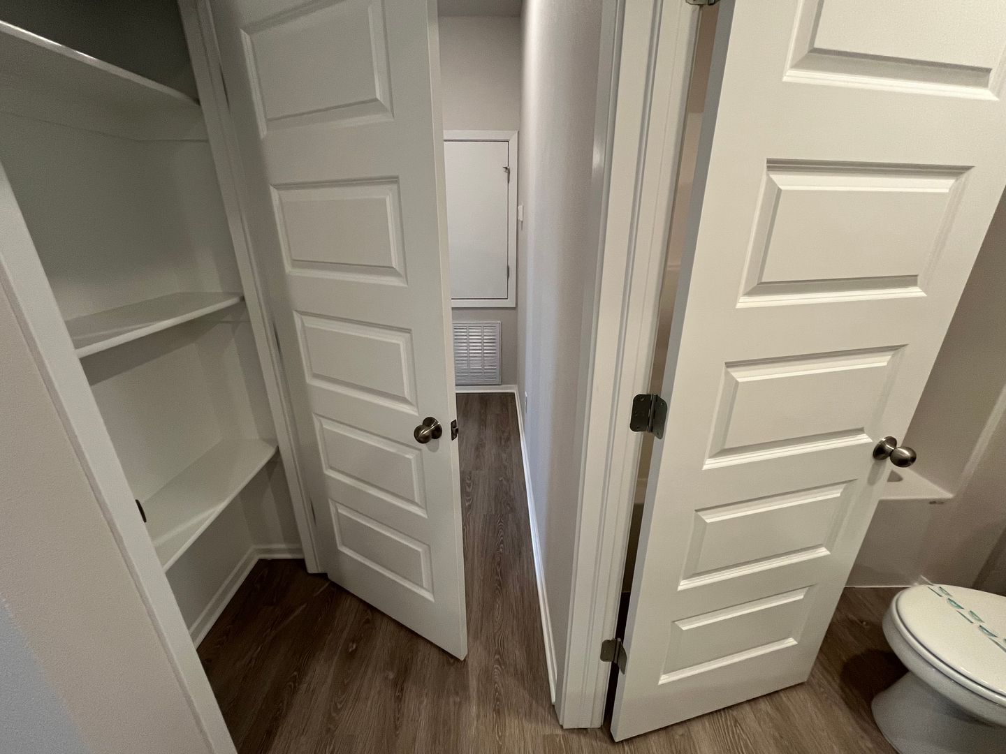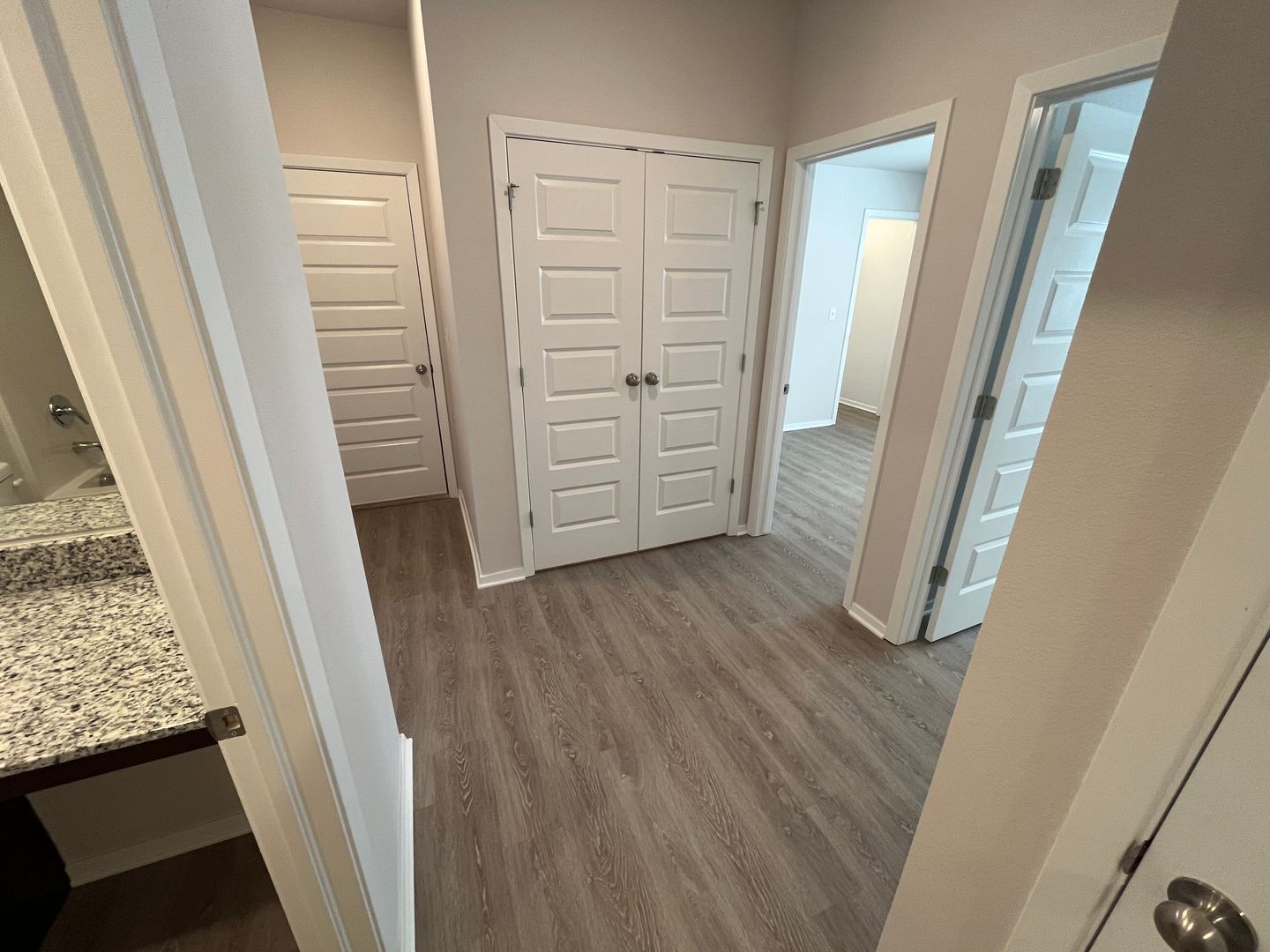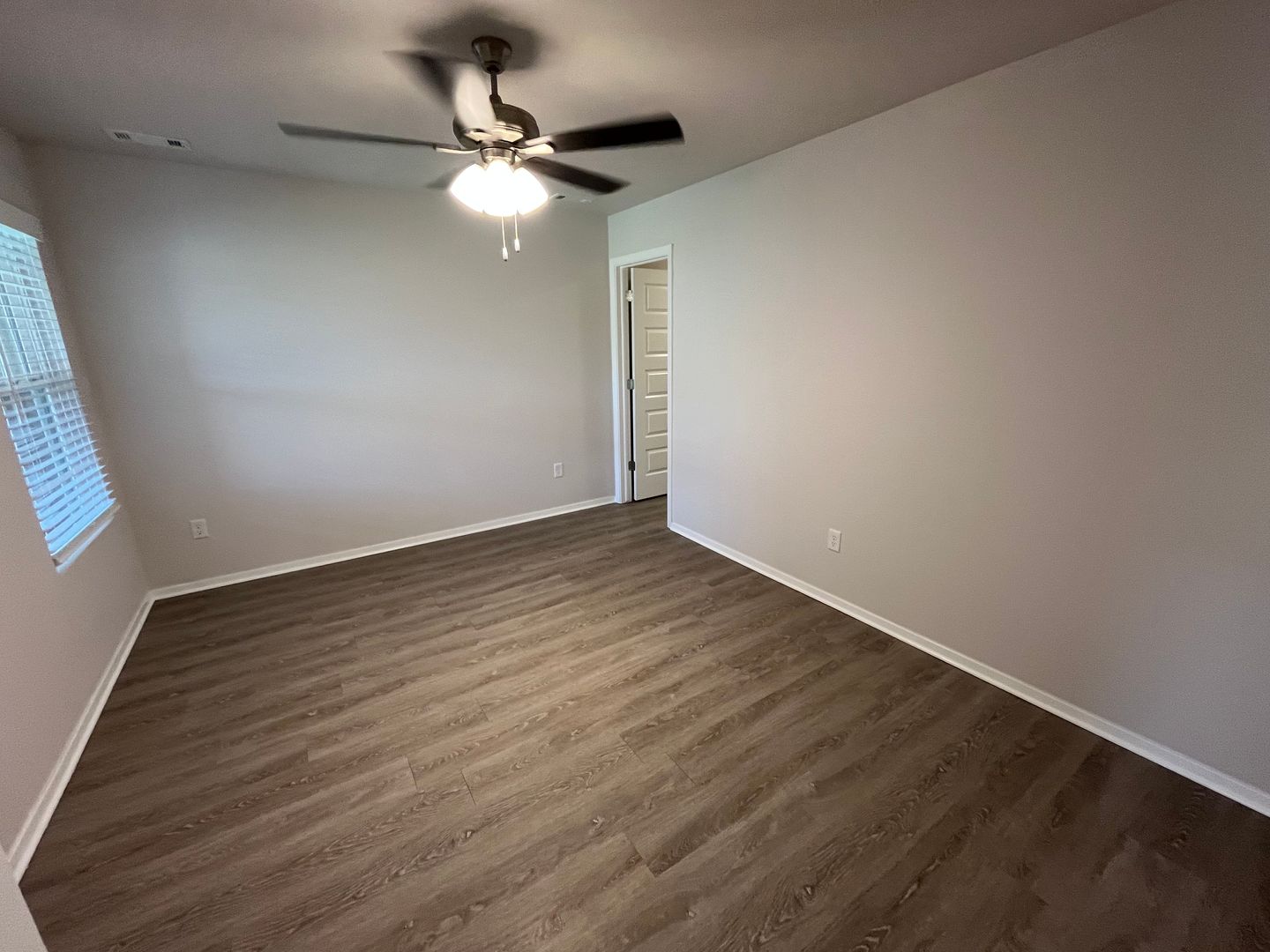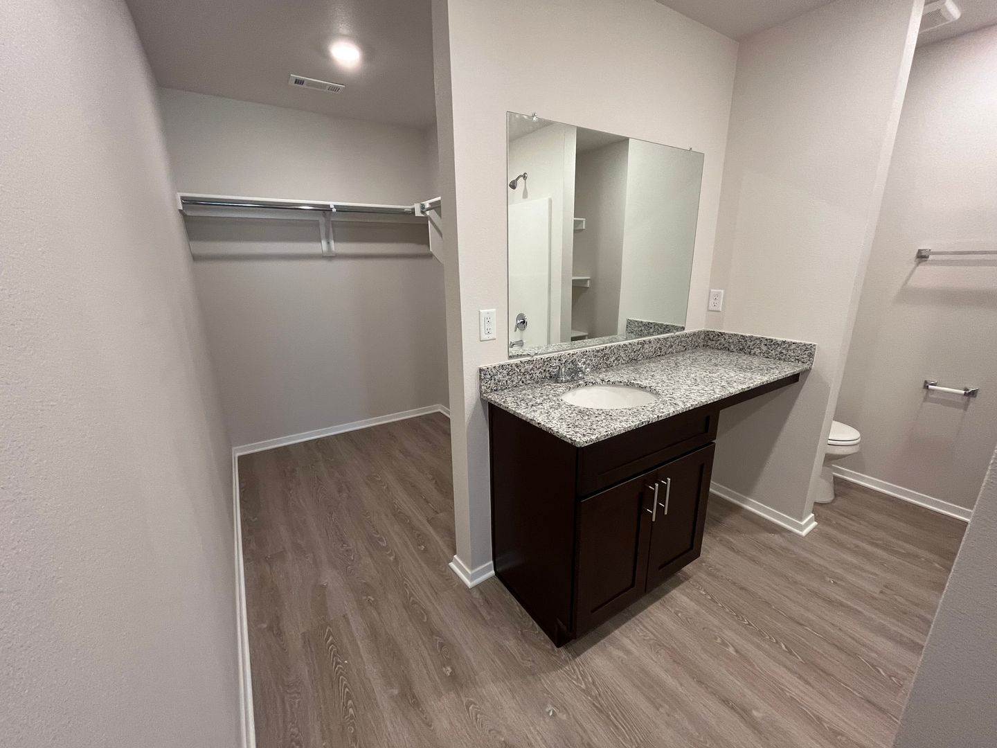 The spacious primary suite includes a walk-in closet, providing ample storage space.