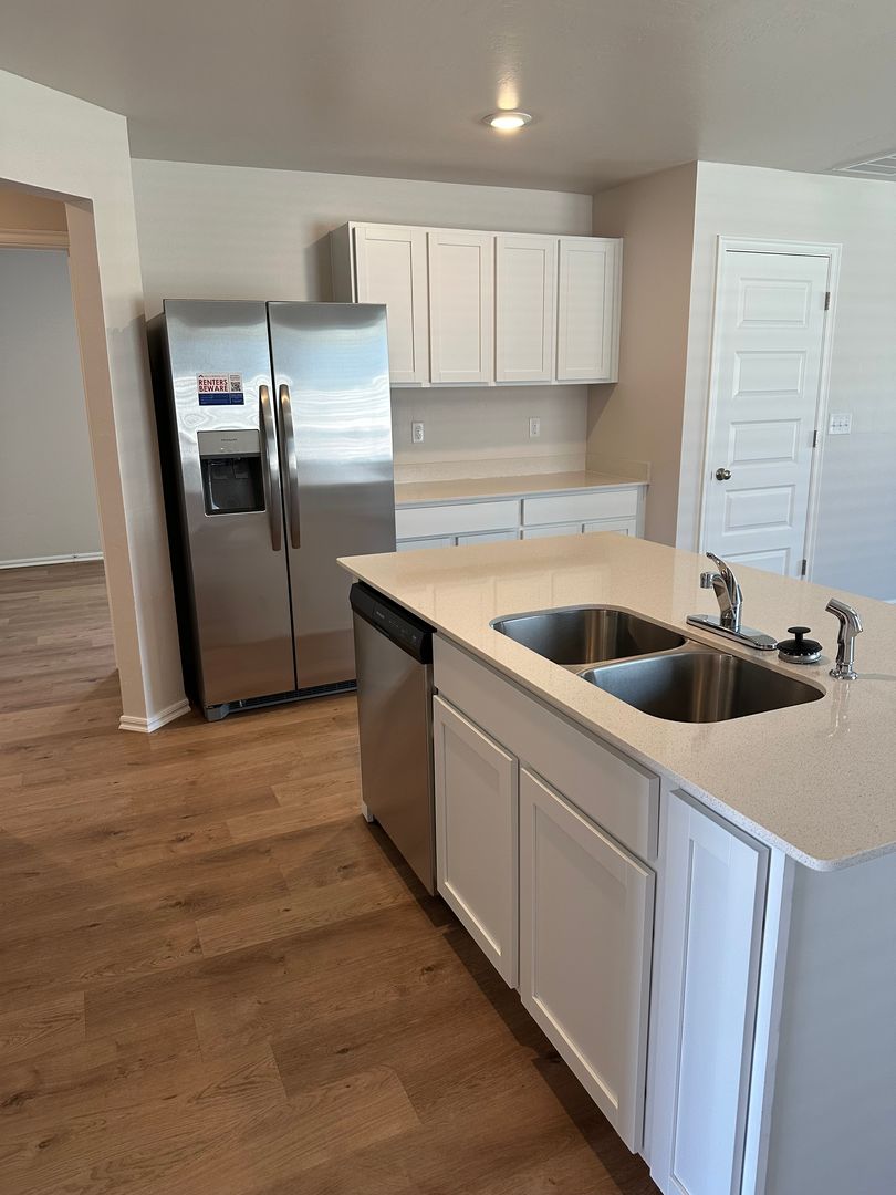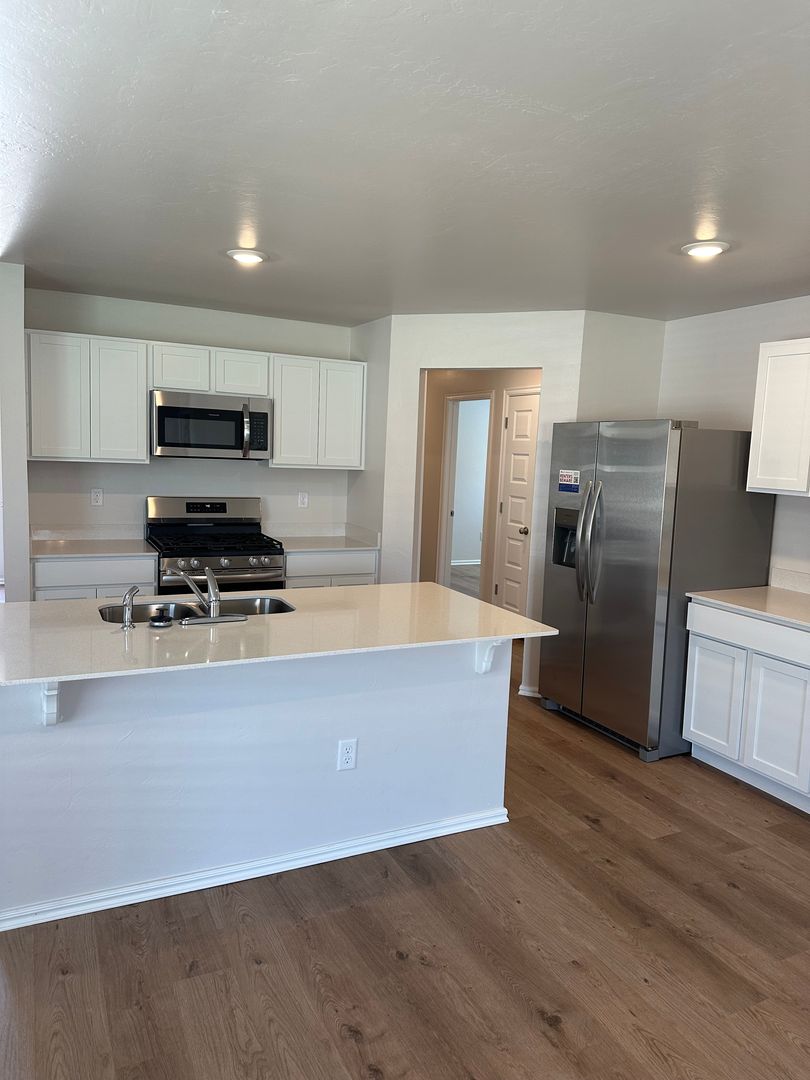 which is equipped with stainless steel appliances and a functional island. The home features luxury