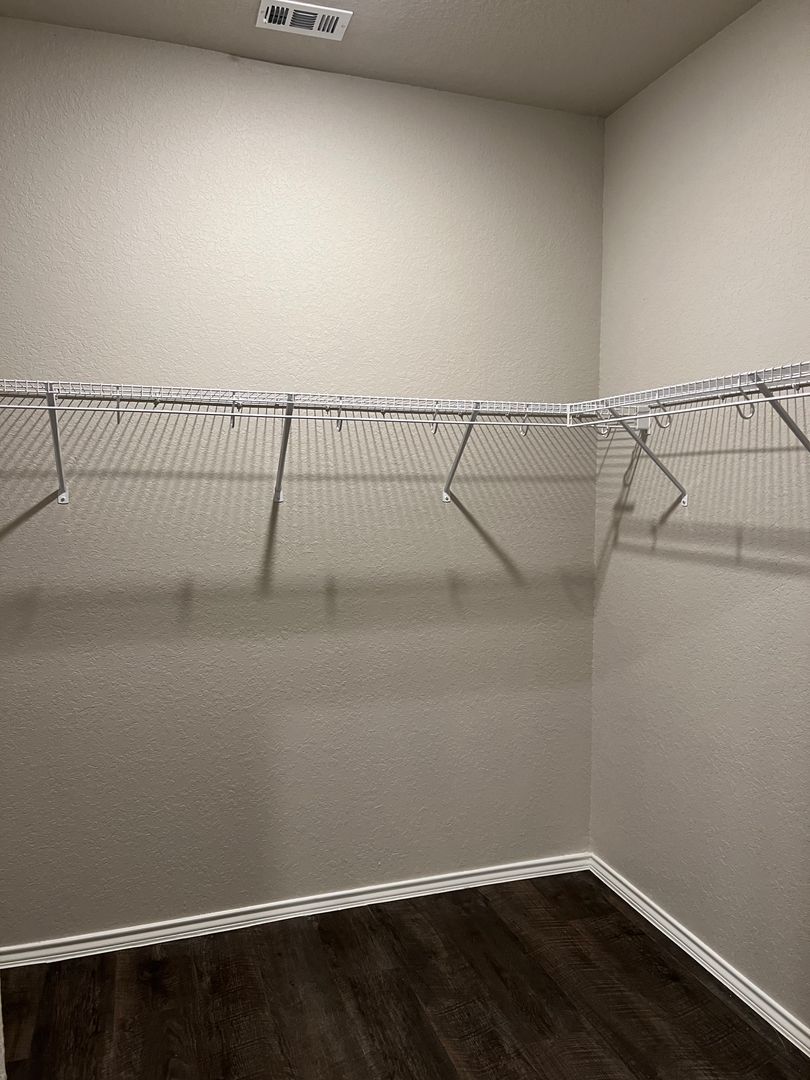 The primary suite is located on the first floor and has a sizeable walk-in closet as well as a separate shower and tub.