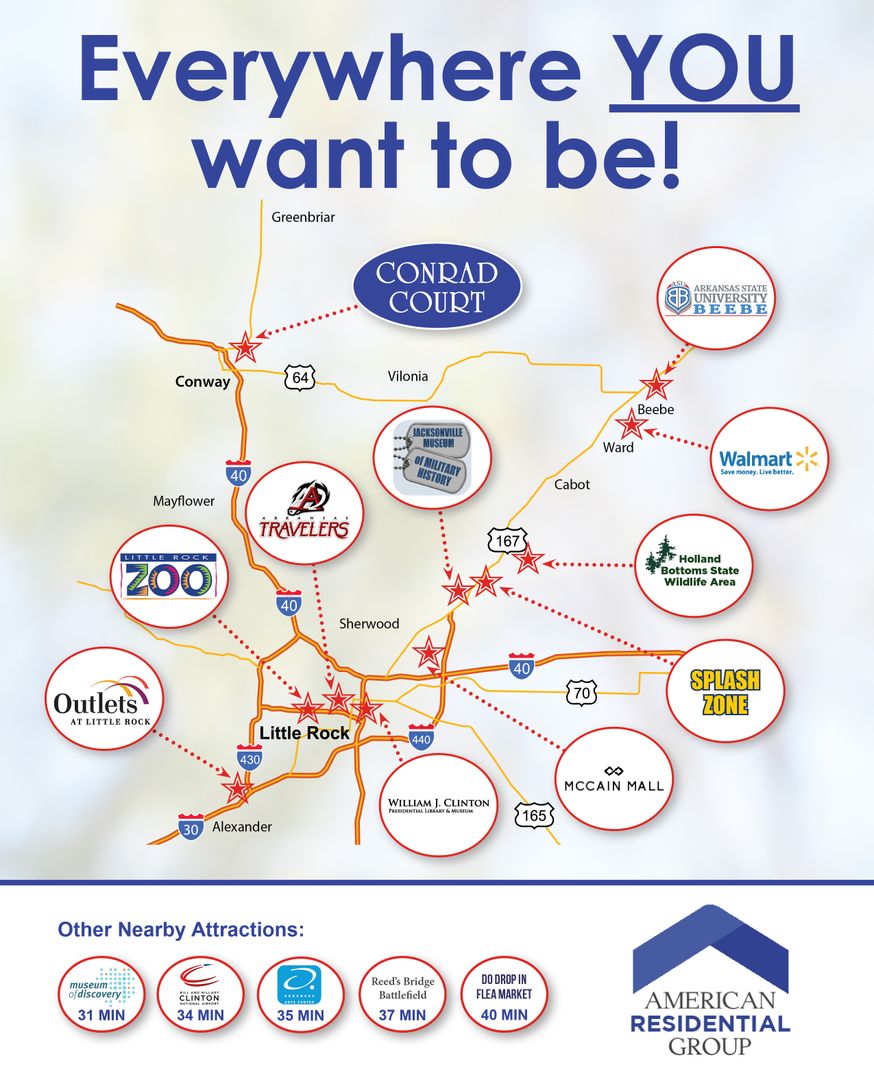 Conway is the city of colleges! Enjoy several shopping options, great restaurants, and much more. Conway is centrally located, and it is just a short drive to Little Rock!