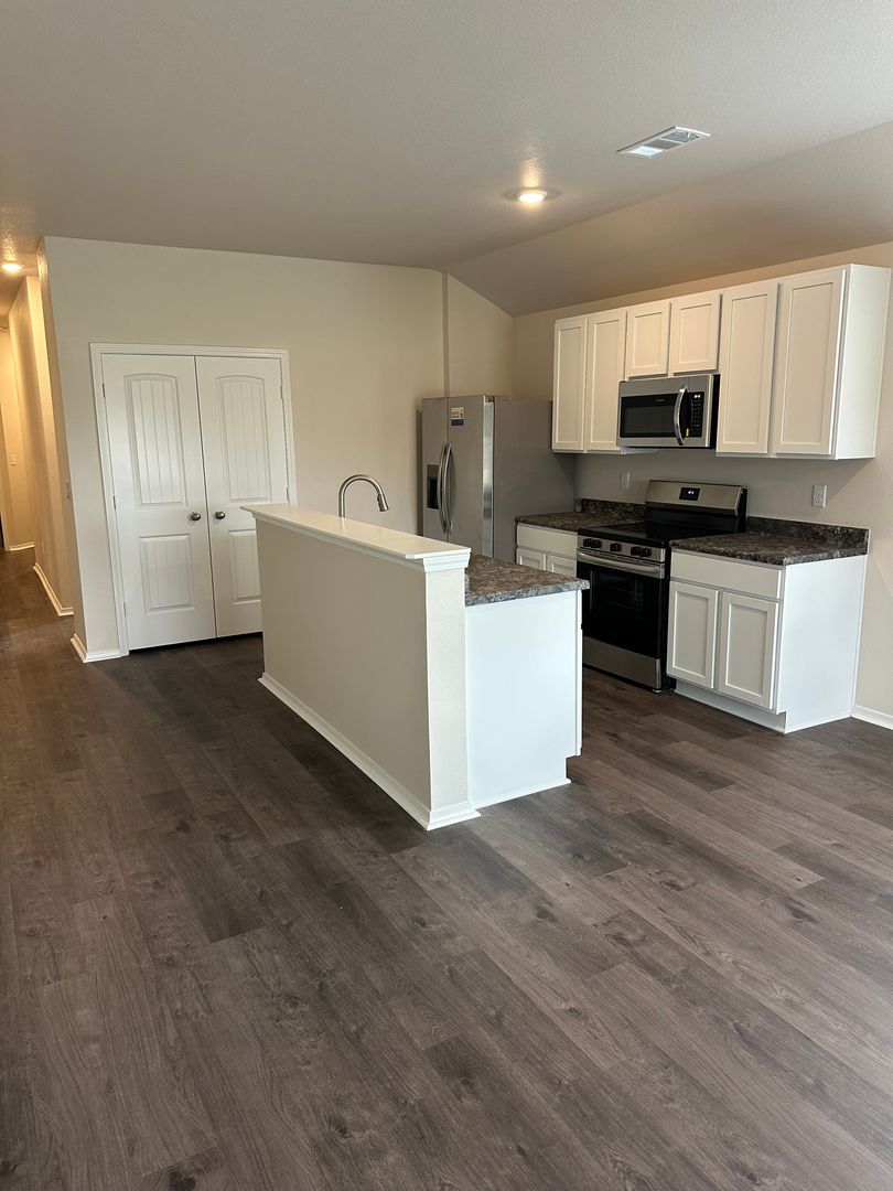 luxury vinyl plank flooring adds a touch of elegance, while the kitchen island provides additional