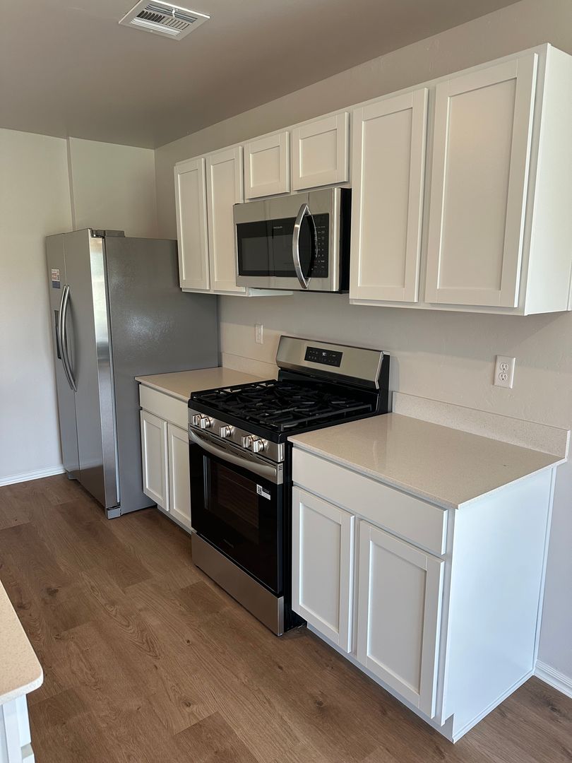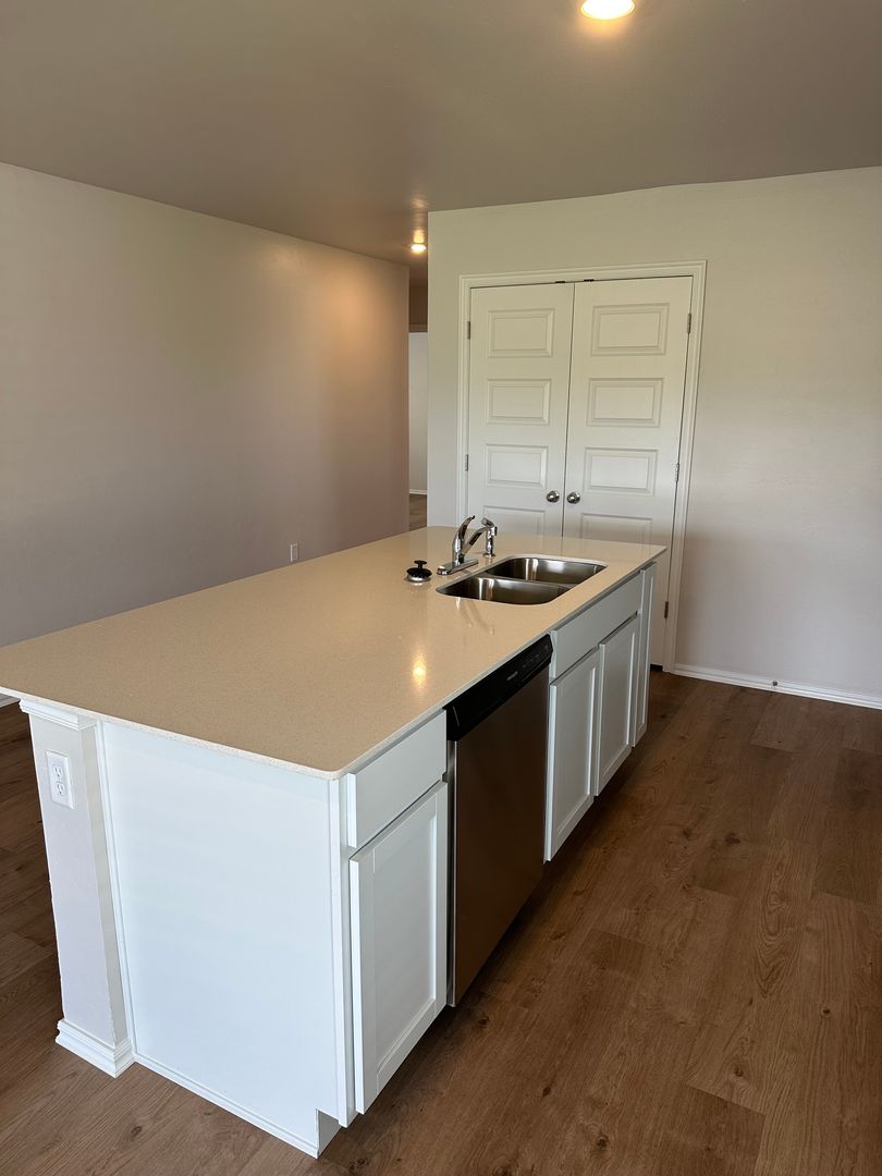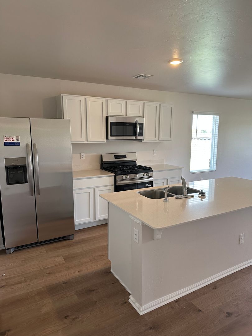 and a convenient kitchen island. The home features luxury vinyl plank flooring throughout, adding a