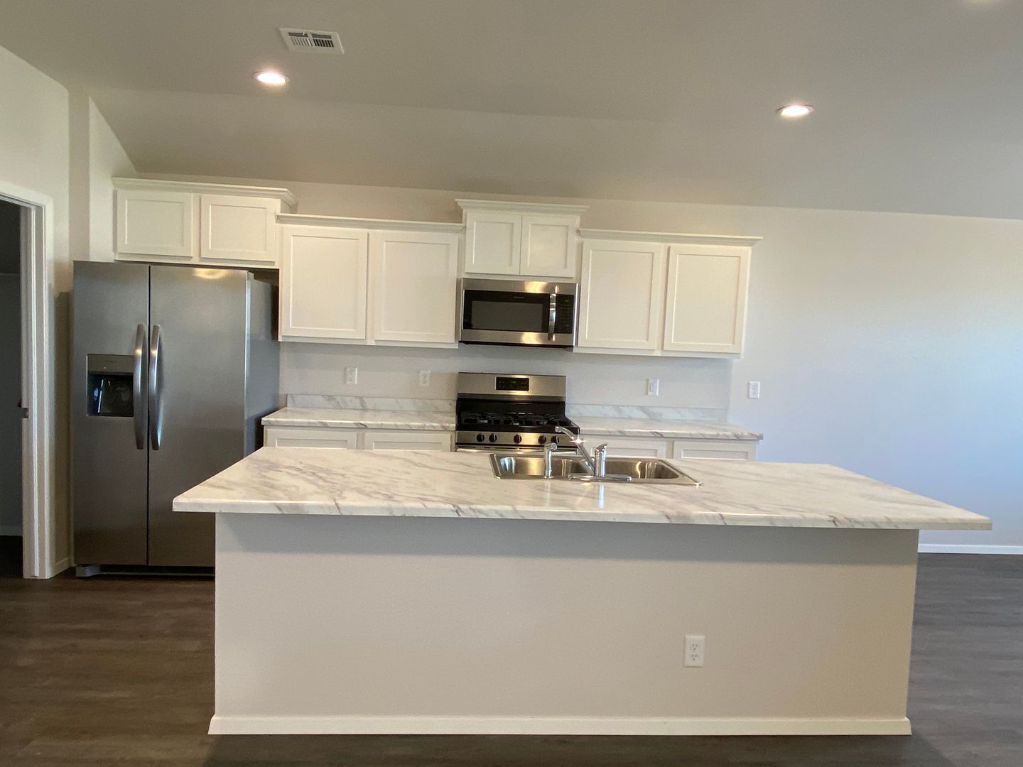 The spacious kitchen has plenty of counter tops, including a large island, to prepare your favorite meals and a pantry to store all your extras.