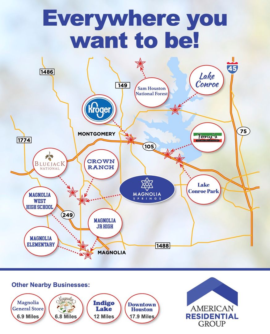 Magnolia Springs community is located north of SH 249 on FM 1486, minutes from the beautiful Bluejack National Golf Course.
