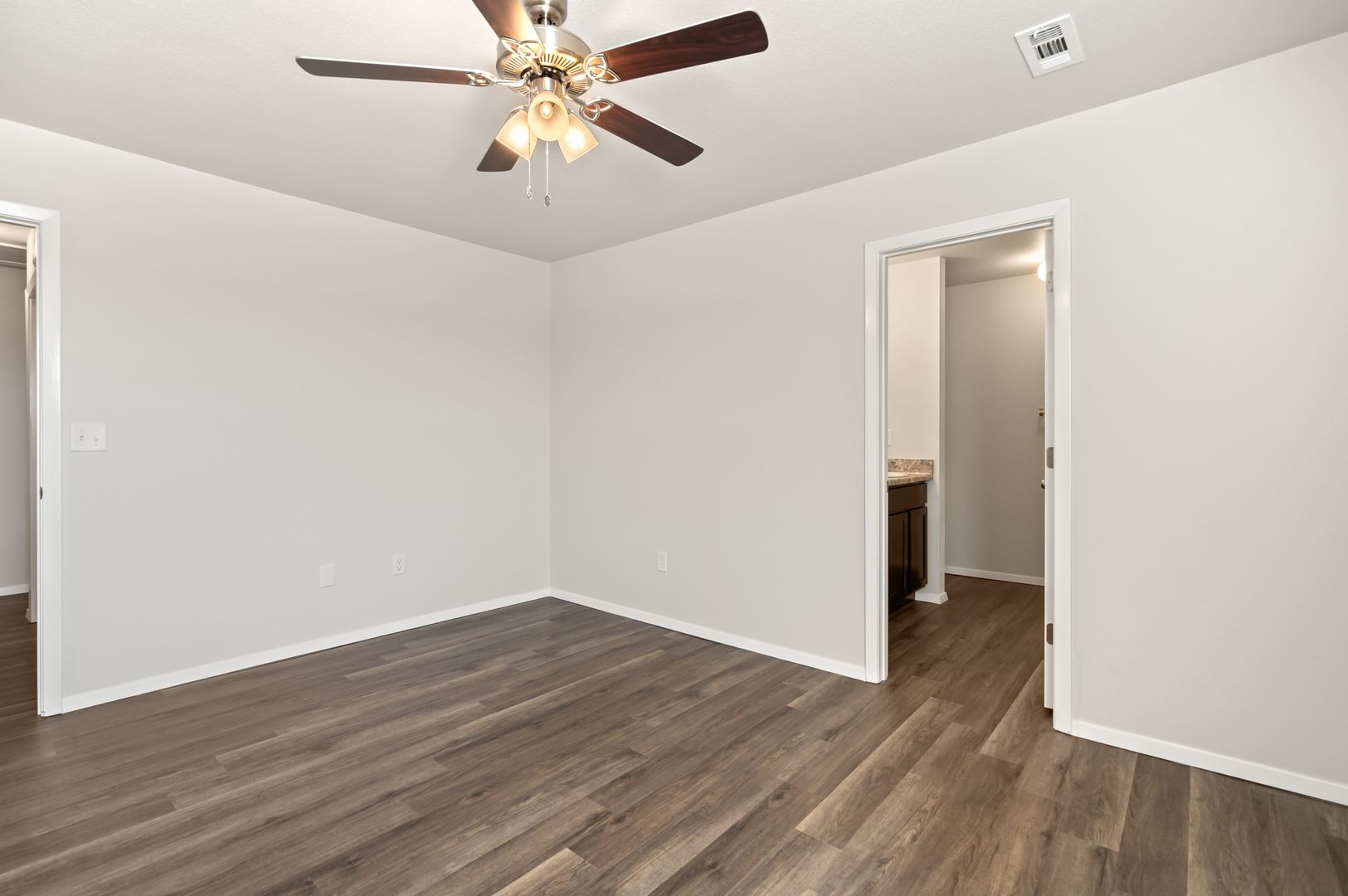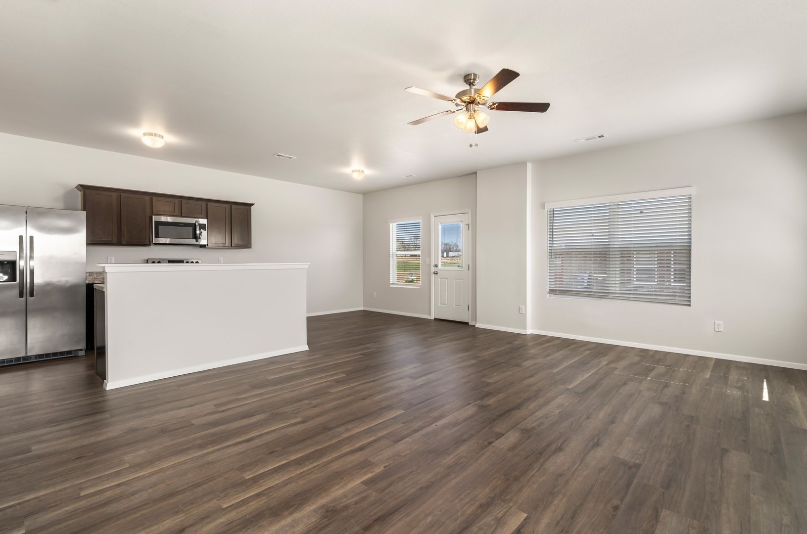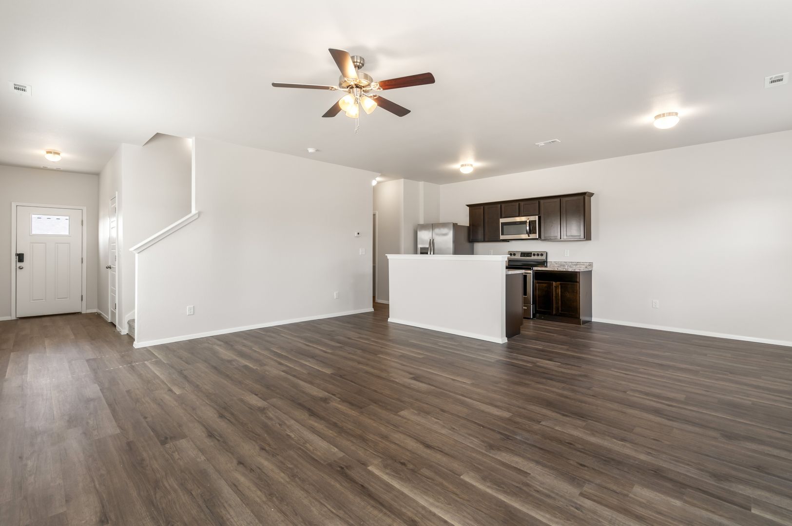 This modern home boasts an open concept layout, luxury vinyl plank flooring, stainless steel appliances, and ceiling fans throughout.